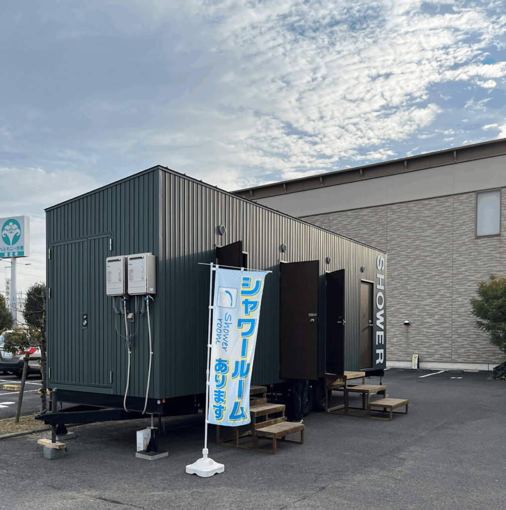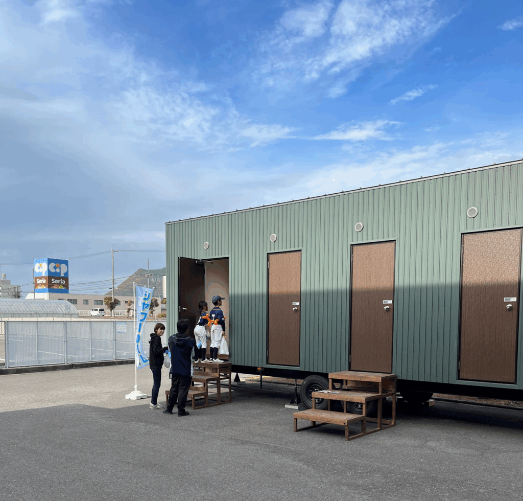 コアキューブのシャワートレーラーは、地震などで被災した地域へ、迅速に温かいシャワーを届けるために開発されました。